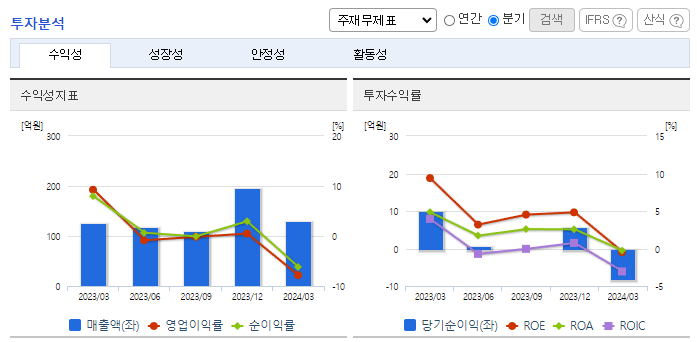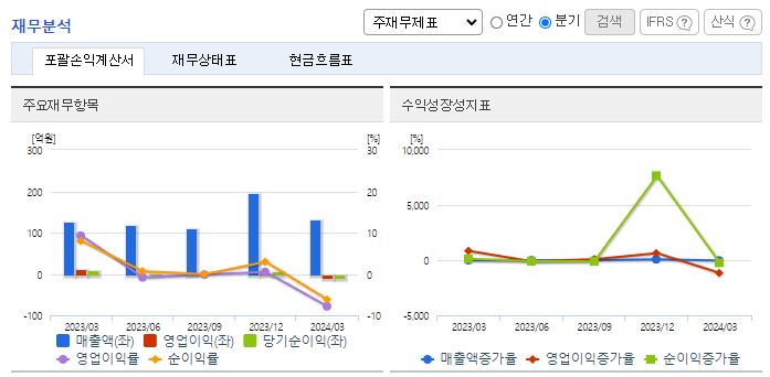 -2024년 3월 전년동기 대비 별도기준 매출액은 3% 증가, 영업이익 적자전환, 당기순이익 적자전환. 현재 대부분의 매출은 정부주도 사업인 방위사업/우주개발사업에 참여 내수 매출이며, 향후 해외시장 판로 개척으로 수출을 통한 매출을 기대하고 있음. AIRBUS와의 프로젝트를 통해 전자기파(EMP)에 대한 방호기술을 인정을 받았으며, 국내시장의 점유율을 높여가고 있음.