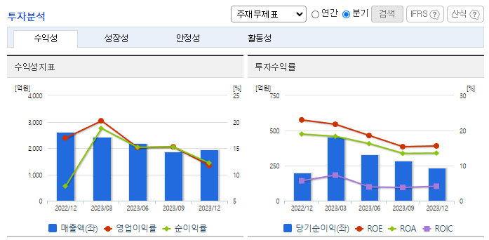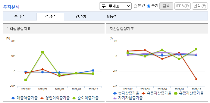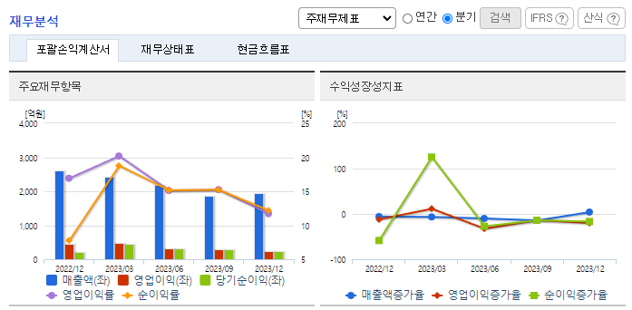 -2023년 12월 전년동기 대비 연결기준 매출액은 22.6% 감소, 영업이익은 35.5% 감소, 당기순이익은 19.9% 감소. 세계경제는 COVID-19의 장기화, 미중갈등, 전쟁 및 글로벌 경기 침체 등으로 불확실성이 확대되었으며 어려운 경영 여건이 지속됨. 최근 경기침체와 전기차 수요의 감소로 동사의 주요 전방산업인 2차 전지 산업의 성장이 다소 둔화된 모습을 보이고 있음.
