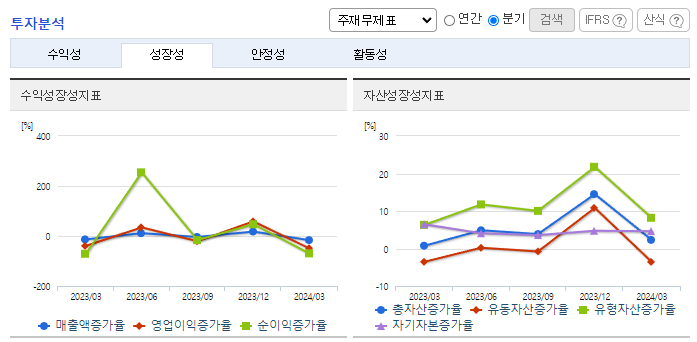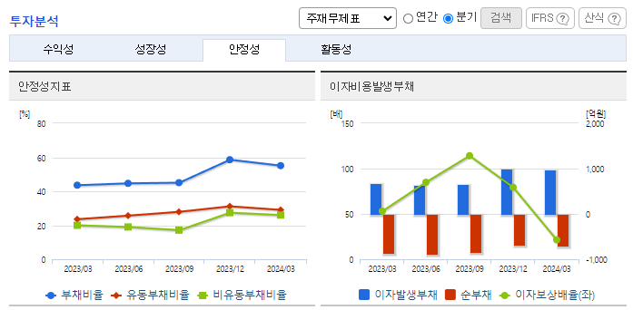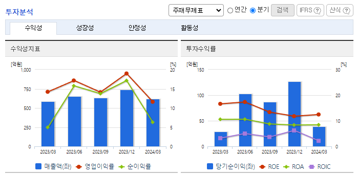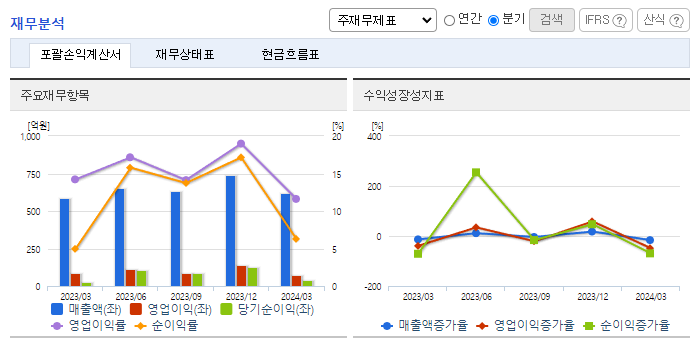 -2024년 3월 전년동기 대비 연결기준 매출액은 5.5% 증가, 영업이익은 13.9% 감소, 당기순이익은 51% 증가. AI 열풍에 힘입어 IT 인프라 통합 제공 서비스를 제공하는 동사의 외형도 성장하는 추세임. 매출이 전년동기 대비 5.5%가량 증가함. 종속회사인 엑스게이트의 자체 보안솔루션 VPN을 동사의 클라우드 호스팅 및 보안관제서비스 사업과 연계할 예정으로 매출과 순이익 확대가 기대됨.