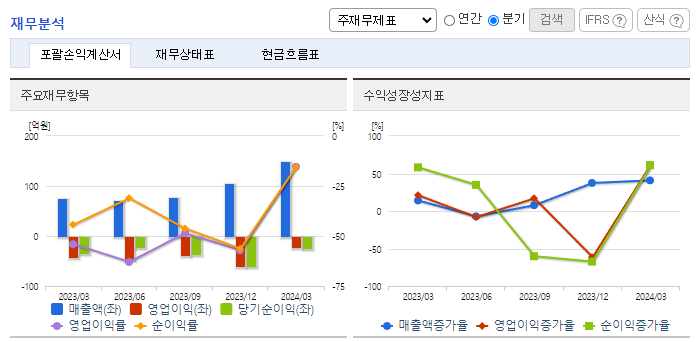 -2024년 3월 전년동기 대비 연결기준 매출액은 93.7% 증가, 영업손실은 44.8% 감소, 당기순손실은 36.9% 감소. 동사는 2023년 '마이니멀 플랜트 콜라겐 펩타이드', '마이니멀 플랜트 락토바실러스 균주' 등 신제품을 출시하여 누적 매출액 22,551백만 원 시현함. 2023년 12월 미국 FDA GMP 인증을 획득하였으며, 규모가 큰 미국 시장과 성장성이 돋보이는 유럽 시장 진출에 본격적인 준비를 하고 있음.