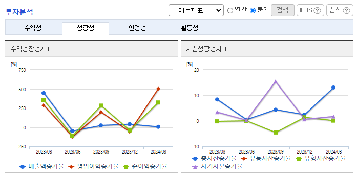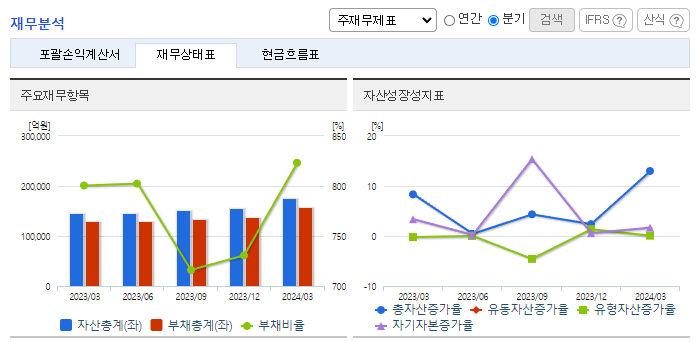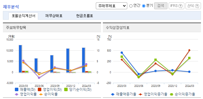 -2024년 1분기 연결기준 영업이익은 전년동기 대비 37.7% 감소, 당기순이익은 41% 감소. 주식과 채권 등을 운용하는 자기 매매 부문의 부진과 부동산 PF 시장의 환경악화로 인한 IB 부문 이익감소로 1분기 영업이익과 당기순이익이 큰 폭으로 줄어듦. 차액결제거래 수수료 중개 이익 회복으로 인한 장외파생상품 부문과 거래량 증가로 인한 위탁매매 부문의 이익은 증가함. 관계사에 대한 지분법손익은 적자를 기록함.