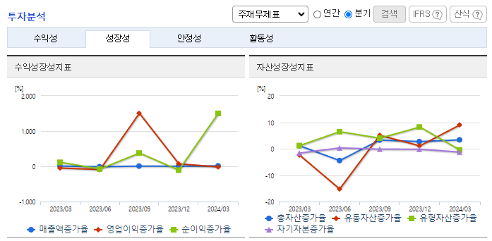 -2024년 3월 전년동기 대비 별도기준 매출액은 9.9% 증가, 영업이익은 76.7% 증가, 당기순이익은 33.5% 증가. 계면활성제 산업의 성장은 지속적으로 이어지고 있음. 중국의 저가 공세가 지속되고 있긴 하나 기술 확보 등의 노력으로 높은 국내 시장 점유율을 유지하며 매출은 성장하는 추세를 보임. 정부지원 과제를 통해 CCU 기술을 확보하고 2차 전지 핵심 소재를 개발해 시제품 테스트를 진행 중에 있음.