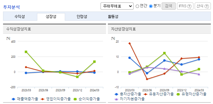 -2024년 3월 전년동기 대비 연결기준 매출액은 4.1% 감소, 영업이익은 15.6% 감소, 당기순이익은 17.2% 감소. 경제위기 및 도시가스의 보급 및 정부의 자동차세율 인상 등으로 윤활유 사업이 위축되어 동사의 사업에 영향을 미침. 케이디탱크터미널의 신규사업(바이오디젤)을 위한 생산설비 신설로 바이오디젤의 보급확대 및 활성화를 통하여 안정적인 매출 확보와 수익실현을 도모함.