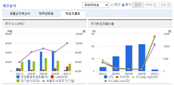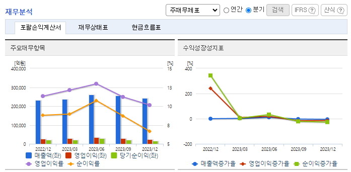 -2023년 12월 전년동기 대비 연결기준 매출액은 15.3% 증가, 영업이익은 60.5% 증가, 당기순이익은 62.3% 증가. ASP 상승 지속과 원화 약세 효과로 외형 확대되었으며, 강력한 물량효과, 가격효과, 믹스효과 등이 수익성 개선을 주도하며 영업이익 큰 폭으로 증가함. 올해도 우수한 품질 평가를 바탕으로 전기차 시장에서 성장세를 이어갈 것으로 기대하고, 해외시장에서의 판매량 또한 확대될 것으로 기대함.