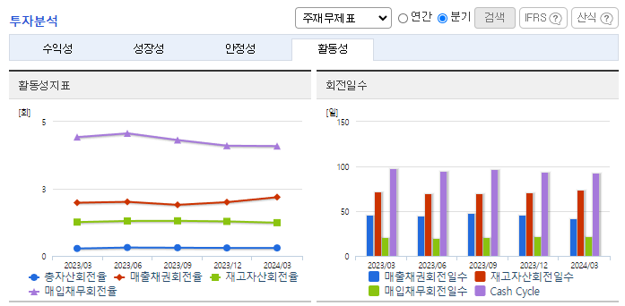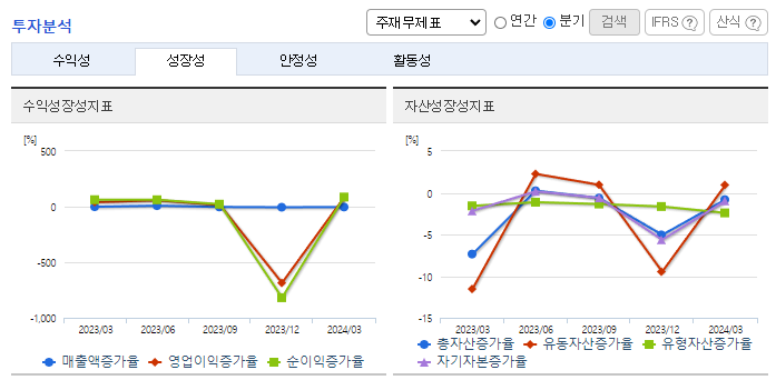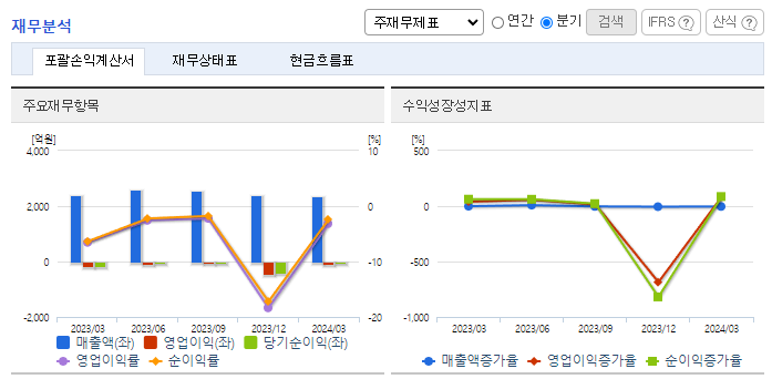 -2024년 3월 전년동기 대비 연결기준 매출액은 2.4% 감소, 영업손실은 52.8% 감소, 당기순손실은 63.4% 감소. 전체 사업부문에서 매출이 감소하였으며 수출부문에서 18.8%, 내수부문에서 1.2%가 감소함. 그럼에도 불구하고 원가 및 판관비 관리를 통해 손실은 감소함. 동사 창업주 일가 모두 경영진에서 사임하고 사모펀드 한앤컴퍼니가 경영권을 갖게 되면서 오너리스크를 해소하고 경영 정상화에 주력할 예정.