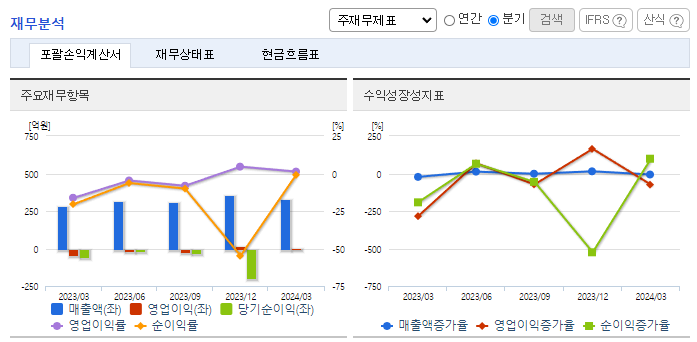 -2024년 3월 전년동기 대비 별도기준 매출액은 18.2% 증가, 영업이익 흑자전환, 당기순손실은 94.9% 감소. 고객사인 삼성전자의 갤럭시 S24 판매 호조와 스마트폰 시장의 PMIC와 AP 물량 및 수요 증가로 인해 매출액이 증가하였으며, 영업이익과 당기순이익 또한 증가함. 모바일 수요가 개선됨에 따라 전방시장과 동반하여 안정적인 성장세를 유지할 수 있을 것으로 예상됨.