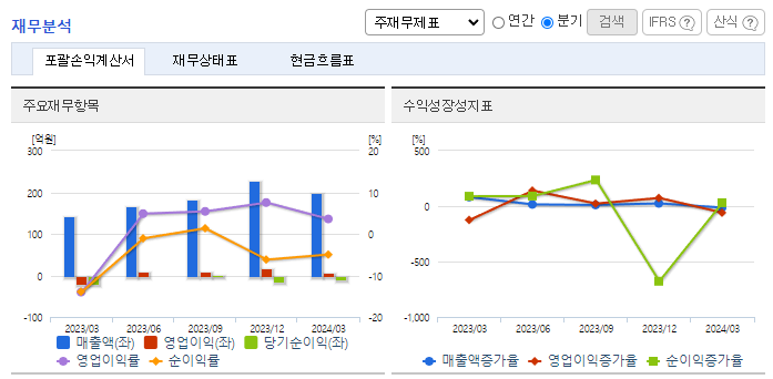 -2024년 3월 전년동기 대비 연결기준 매출액은 45.4% 증가, 영업이익 흑자전환, 당기순손실은 54.3% 감소. 주요 품목들의 매출 호조로 지난해 연간 기준 영업익 흑자전환에 이어 4분기 연속 흑자 기조를 이어 가고있음. 동사는 향후 어나프라주(성분명 오피란제린)의 성공적인 국내 상업화를 위한 준비에 박차를 가하고 있어 견조한 외형성장 및 수익성 확대가 예상됨.