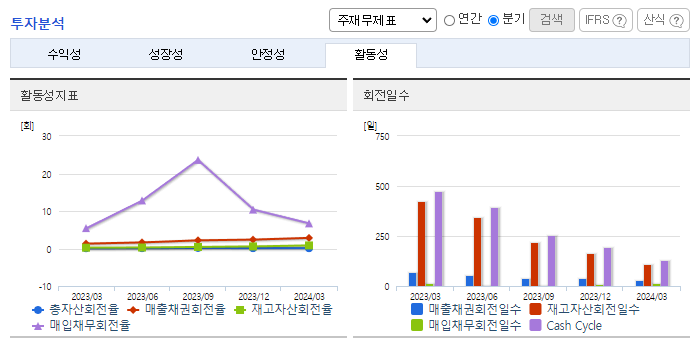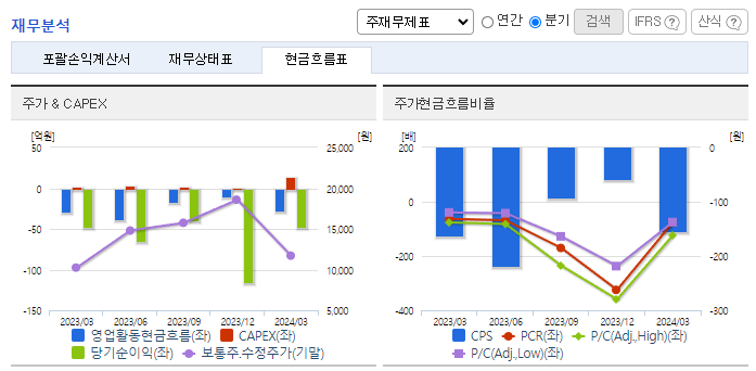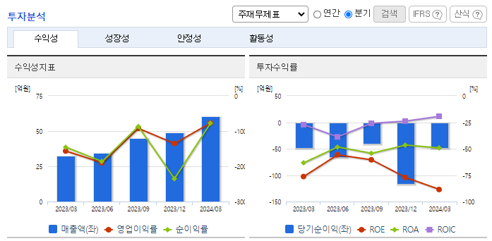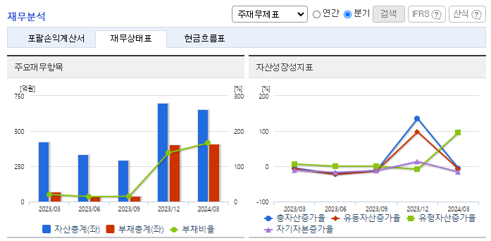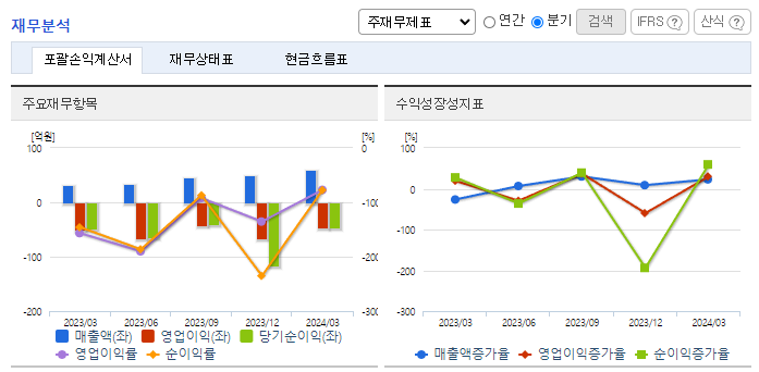 -2024년 3월 전년동기 대비 별도기준 매출액은 85.5% 증가, 영업손실은 8.7% 감소, 당기순손실은 1.6% 감소. ISP(차량 내 이미지 센서 관련 반도체 제품) 3,960백만 원 및 AHD(고해상도 영상 데이터 처리 반도체 기술) 1,878백만 원으로 매출 규모 성장함. 동사는 Multi-CFA를 지원하는 고해상도 ISP 개발, 다중 센서 융합 ADAS SoC 개발, Battery Management IC 개발 등을 수행 중.