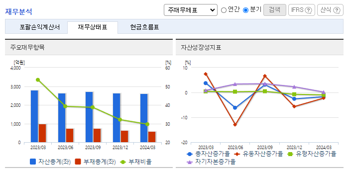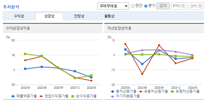 -2024년 3월 전년동기 대비 연결기준 매출액은 18.3% 감소, 영업이익은 28.3% 감소, 당기순이익은 13% 감소. 수출 비중이 높은 기업으로서 해외 정세의 영향을 크게 받음에 따라 매출이 전년 동기 대비 감소하였음. 동사는 국내 건강기능식품 업체 중 가장 많은 43건의 개별인정원료를 확보하고 있으며 지속적인 신규 기능성 원료 개발을 통해 시장의 수요에 부합하는 개별인정원료의 수를 늘릴 계획임.