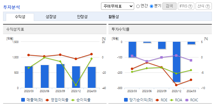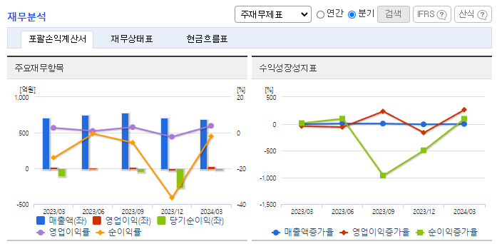 -2024년 3월 전년동기 대비 연결기준 매출액은 3.1% 감소, 영업이익은 38.7% 증가, 당기순손실은 90.5% 감소. 동사는 온라인쇼핑시장 호조 및 신용카드 PG사업 확대 및 계열사 연구개발, 마케팅등 비용 감소로 이익성 증가하였음. 휴대폰 결제 내역을 활용한 비금융데이터를 이용한 신용평가 모델을 개발을 완료하였고, 온라인쇼핑 시장의 성장, 다날 신용카드 PG사업 확대 등에 따라 성장이 기대됨.