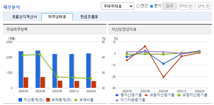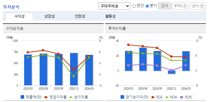 -2024년 3월 전년동기 대비 별도기준 매출액은 1.2% 감소, 영업이익은 19.3% 감소, 당기순이익은 1.1% 감소. 동사의 전체 매출액 중 약 92 %를 차지하는 골판지원단,상자 제품 매출이 전년동기 감소하였고 비용 증가로 영업이익이 감소. 층골심판지제품을 특화시켜 농산물박스 외 기존의 공산품 신장에 주력하며, 3중 골판지(팔레트) 가공시장의 새로운 시장 개척으로 매출액 신장에 노력.