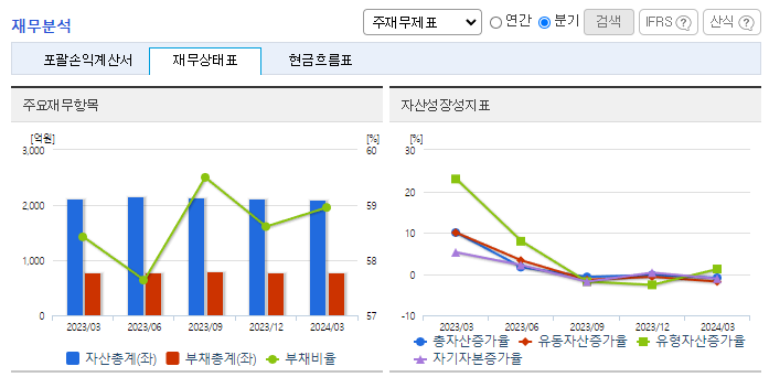 -2024년 3월 전년동기 대비 연결기준 매출액은 19.3% 감소, 영업이익은 79.9% 감소, 당기순이익 적자전환. 전년동기 애니메이션 영화 흥행으로 증가했던 매출액이 올해에는 부재하였고, 유통사업도 부진하여 실적이 대폭 감소함. 웹툰 제작 스튜디오 '스토리작'을 통해 웹툰 및 웹소설을 창작/제작하여 자체 IP를 발굴하고 미디어/콘텐츠 사업 활성화를 추진 중.