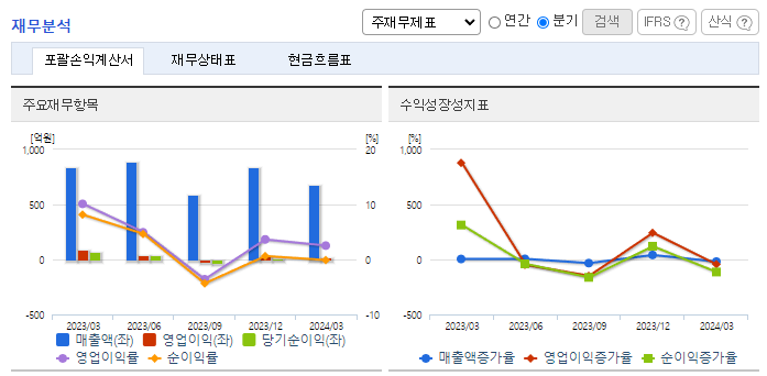 -2024년 3월 전년동기 대비 연결기준 매출액은 19.3% 감소, 영업이익은 79.9% 감소, 당기순이익 적자전환. 전년동기 애니메이션 영화 흥행으로 증가했던 매출액이 올해에는 부재하였고, 유통사업도 부진하여 실적이 대폭 감소함. 웹툰 제작 스튜디오 '스토리작'을 통해 웹툰 및 웹소설을 창작/제작하여 자체 IP를 발굴하고 미디어/콘텐츠 사업 활성화를 추진 중.