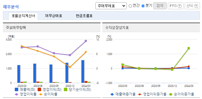 -2024년 1분기 연결기준 매출액은 전년동기 대비 27.6% 증가, 영업이익은 66.8% 증가, 당기순이익은 4% 감소. 에스디생명공학 영업손실 20억 원이 반영되었음에도 불구하고 ETC제품 고마진 품목에서의 고성장세에 따른 매출원가율 하락으로 전년대비 66.8% 증가함. 2023년 12월 화장품 판매를 주요 사업으로 영위하는 에스디생명공학을 400억에 인수하여 종속회사로 편입시킴.