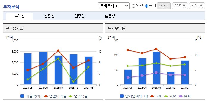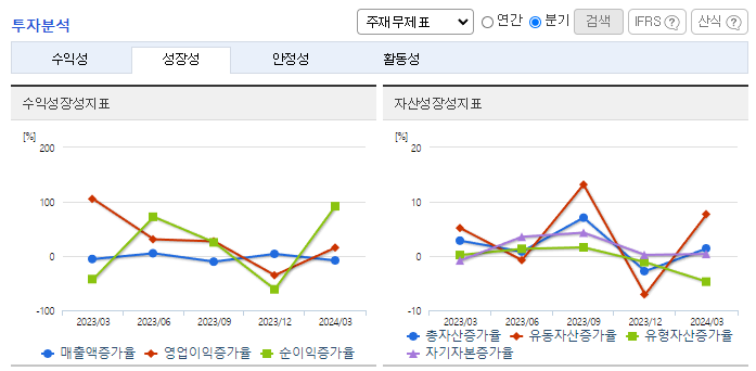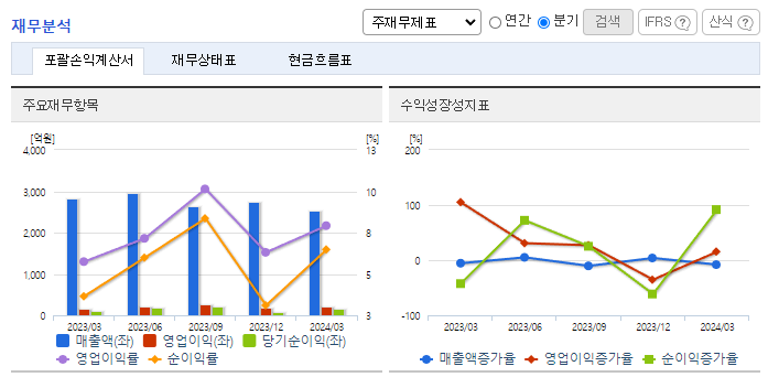-2024년 3월 전년동기 대비 연결기준 매출액은 2.7% 증가, 영업이익은 42.7% 증가, 당기순이익은 30.9% 증가. 화학, 바이오 부문의 매출이 전년동기 대비 증가하고 NAPHTHA 원재료 가격이 감소하면서 동사의 영업이익이 전년동기 대비 약 42 % 증가함. TBHP 등과 같은 원재료 개발을 통한 가격 경쟁력 강화, 품질관리 및 확고한 내수 물량을 바탕으로 전 세계 해외시장으로의 판매 확대에도 주력.