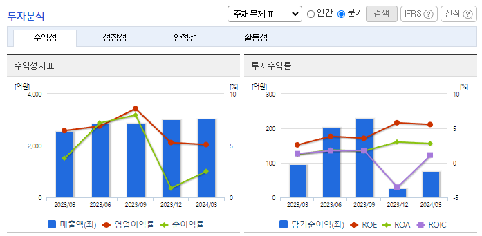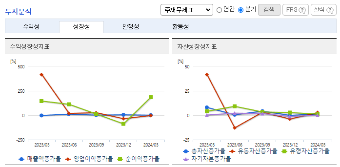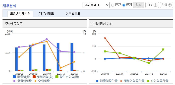 -2024년 3월 전년동기 대비 연결기준 매출액은 19.3% 증가, 영업이익은 5.7% 감소, 당기순이익은 23.7% 감소. 주요 사업 회사들의 외형 성장으로 매출 증가. 특히 적자기업이었던 에스티젠바이오가 흑자로 전환하였음. 수석, 동천수 신공장 가동으로 일시적으로 매출원가율 상승함. 용마로지스는 2025년 완공을 목표로 안성 신허브센터 증설을 통해서 물류 능력 제고할 예정임.