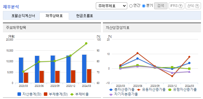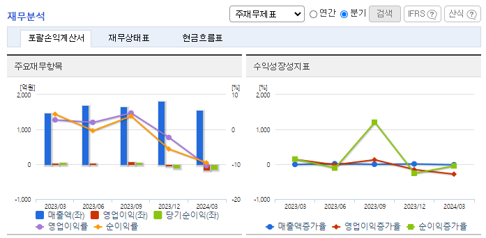 -2024년 3월 전년동기 대비 연결기준 매출액은 5.6% 증가, 영업이익 적자전환, 당기순이익 적자전환. 해외사업부문에서 매출 비중이 높은 캔박카스가 전년 동 분기 수출국가의 경기침체로 매출이 많이 감소하였었는데 일부 회복하는 모습을 보이고 있음. 경쟁력 강화를 위해 지속적으로 투자 규모를 확대해가고 있으며 현재 항암제를 중심으로 한 First-in-Class 신약 개발을 목표로 경쟁력을 확보해 나가고 있음.