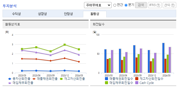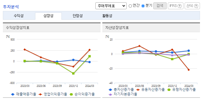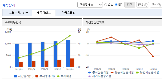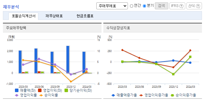 -2024년 3월 전년동기 대비 연결기준 매출액은 5.4% 감소, 영업이익은 58.3% 감소, 당기순이익은 90% 감소. 건재 매출이 12.9% 감소, 섬유 매출이 7.8% 감소함에 따라 전체 매출이 감소하였고 매출 감소폭보다 매출원가 감소폭이 적어 영업이익이 크게 감소함. 70년 된 업력을 바탕으로 한 기술력 및 전국 규모의 레미콘 공급 네트워크를 갖추며, 양/질적 확대를 위한 지속 투자를 시행하며 성장하고 있음.