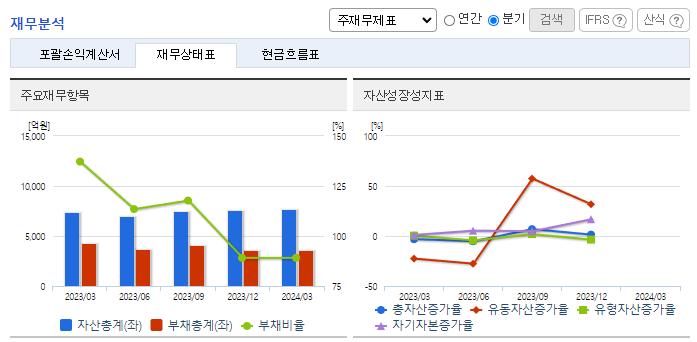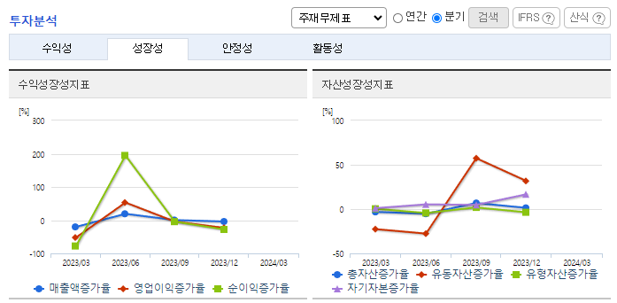 -2023년 12월 전년동기 대비 별도기준 매출액은 22% 증가, 영업이익은 9.5% 감소, 당기순이익은 6.2% 감소. 2024년에는 전방수요 증가 둔화 등으로 어려운 경영환경이 지속되고 있음에도 불구하고, 동사는 지속적인 투자를 바탕으로 새로운 사업기회를 끊임없이 탐색 중임. 영업이익은 투자지속에 따른 감가상각비 증가 영향으로 전년대비 감소한 608억을 기록함.