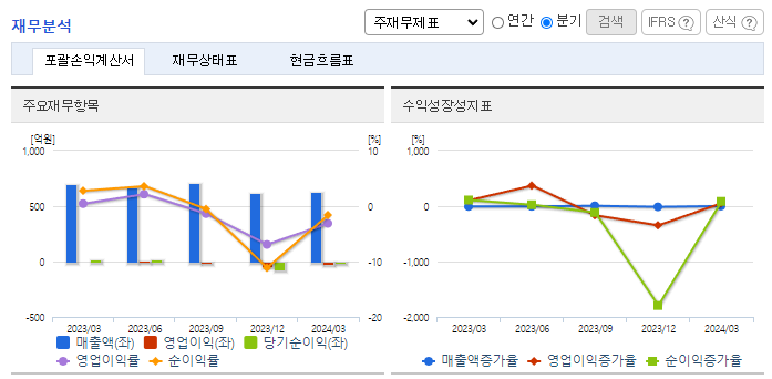 -2024년 1분기 매출액은 전년동기 대비 9.6% 감소, 영업이익 적자전환, 당기순이익 적자전환. 주요 사업 음악 플랫폼 FLO은 시장 경쟁이 격화되고 있으나 기능 고도화를 위해 AI 언어모델 기반의 음악 추천 기술을 자체개발 하며 일부 서비스에 적용함. 임영웅을 활용한 응원봉, 부가상품 등을 판매하며 소비층을 넓혀 나가고 있으며, 하이브에서 제작한 소속 아티스트들의 포토북 유통을 통해 매출 증대와 신규 사업 확장 진행 중임.