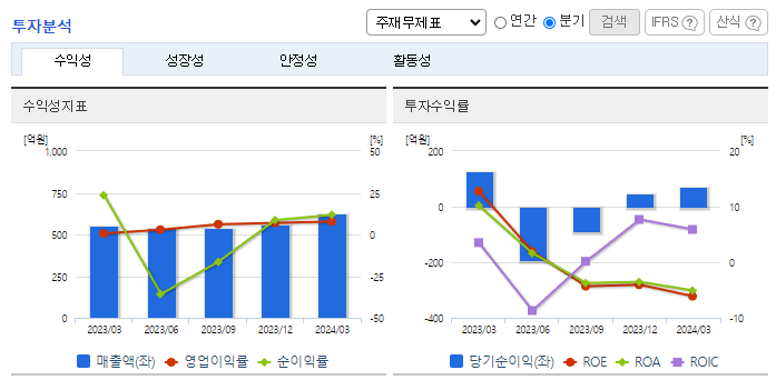 -2024년 3월 전년동기 대비 별도기준 매출액은 13.6% 증가, 영업이익은 1338.9% 증가, 당기순이익은 43.1% 감소. 분기 매출액 중 LAMINATE 강판이 96%를 차지하고 있으며, 중간 소재산업의 특성상 전방산업의 경기변동에 영향을 많이 받는 편임. 산업용 보호필름은 다양하고 안정된 점착력과 우수한 품질로 PC·PET 등 Plastic Sheet 업계 및 강판업계로부터 안정된 수요를 확보하여 향후 성장이 기대됨.