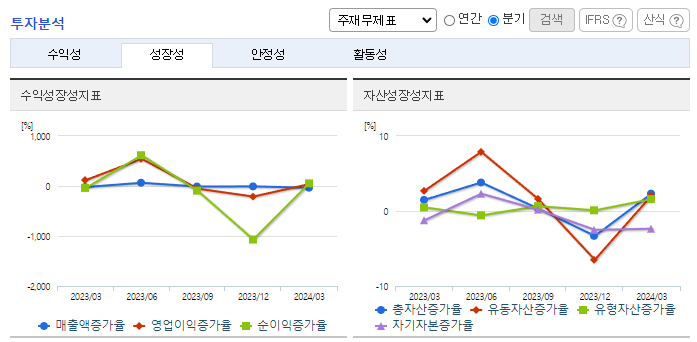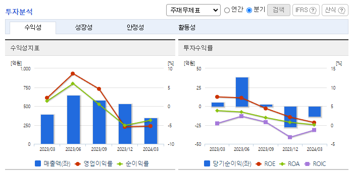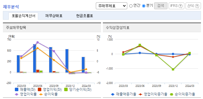 -2024년 1분기 연결기준 매출액은 전년동기 대비 11.4% 감소, 영업이익 적자전환, 당기순이익 적자전환. ESS컨테이너, 장비 등 2차 전지 관련 매출이 큰 폭으로 늘었으나, 주력인 반도체검사 장비의 판매 부진으로 2024년 1분기 영업이익은 적자로 전환됨. 자회사인 디아이비, 브이텐시스템, 디아이머트리얼즈를 통해 2차 전지 장비와 소재 사업을 영위 중이며, 본격적인 실적 성장이 기대됨.