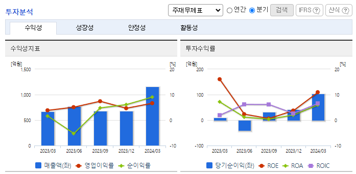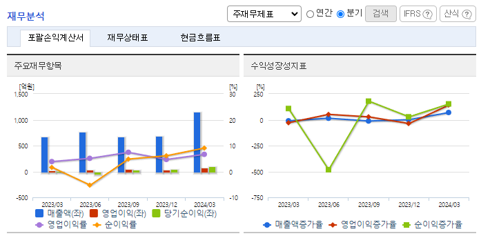 -2024년 3월 전년동기 대비 연결기준 매출액은 71.9% 증가, 영업이익은 197.4% 증가, 당기순이익은 884.3% 증가. 기존 매출 대부분이 국내 고객사 스마트폰에서 발생하였으나 최근 북미 OLED 태블릿 고객사에 납품이 확정되었고, 전장, 전기차 충전 등으로 전방산업 및 고객사의 다변화가 기대됨. 향후 기술의 진보 및 트렌드의 변화를 통하여 출하전망은 언제든 보다 더 큰 성장세로 돌아설 것으로 예상됨.