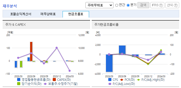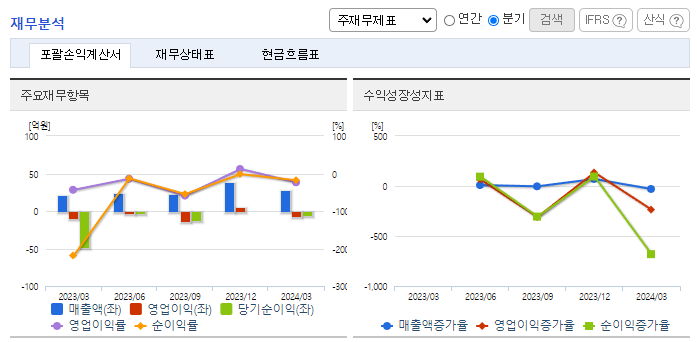 -2024년 3월 전년동기 대비 별도기준 매출액은 26.6% 증가, 영업손실은 31.6% 감소, 당기순손실은 89.6% 감소. 세계 최고의 AP 기업과 협력하여 해당 AP와 호환되는 패널과 SoC를 개발하고 함께 레퍼런스를 만들어 경쟁자의 추적을 따돌리고 있음. 디스플레이 사업 부문에서는 LCoS, OLEDoS, LEDoS 각각에 사용되는 광학 기술을 적절하게 응용해 사업을 전개해가고 있음.
