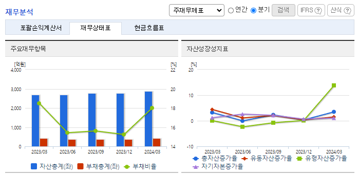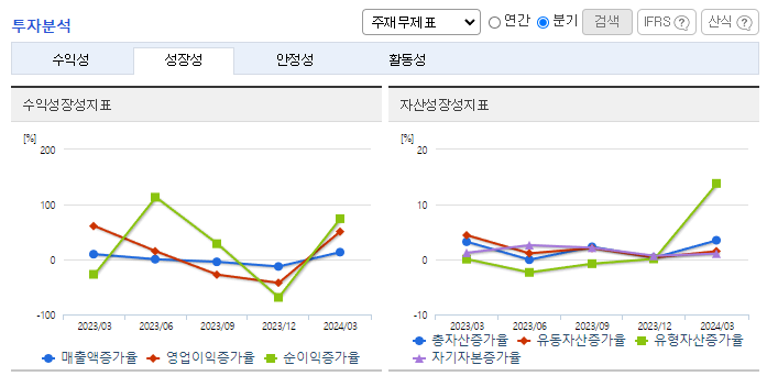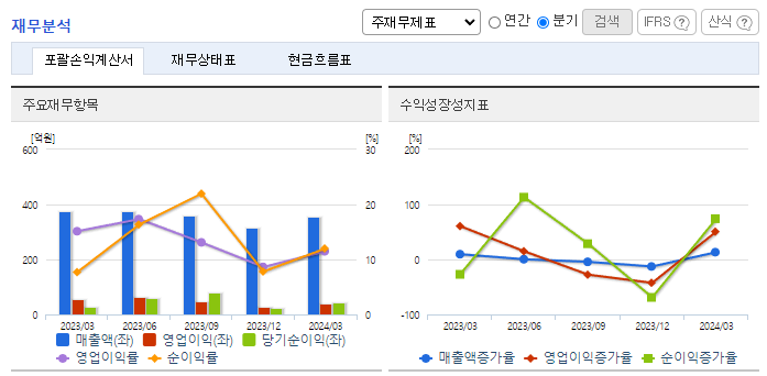 -2024년 3월 전년동기 대비 연결기준 매출액은 5% 감소, 영업이익은 27.9% 감소, 당기순이익은 45.5% 증가. CMOS Detector 사업 부문이 22.89% 증가했지만, I/O Sensor 사업 부문이 62.26% 감소하면서 전체 외형 성장에 악영향을 줌. 고금리 유지와 지정학적 리스크가 지속되면서 대내외 경영의 불확실성은 여전히 클 것으로 예측되지만, 연구개발을 통한 신제품 출시, 영업망 안정 계획 중임.