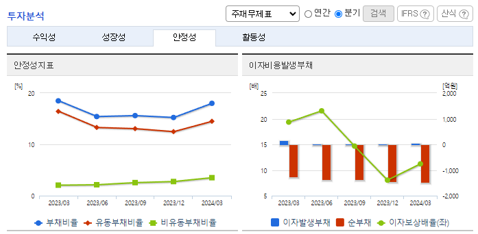 -2024년 3월 전년동기 대비 연결기준 매출액은 5% 감소, 영업이익은 27.9% 감소, 당기순이익은 45.5% 증가. CMOS Detector 사업 부문이 22.89% 증가했지만, I/O Sensor 사업 부문이 62.26% 감소하면서 전체 외형 성장에 악영향을 줌. 고금리 유지와 지정학적 리스크가 지속되면서 대내외 경영의 불확실성은 여전히 클 것으로 예측되지만, 연구개발을 통한 신제품 출시, 영업망 안정 계획 중임.