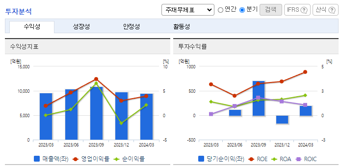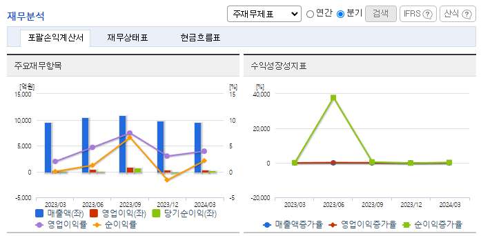 -2024년 3월 전년동기 대비 연결기준 매출액은 0.9% 감소, 영업이익은 100.6% 증가, 당기순이익은 1,916.1% 증가. 매출은 전년도 수준을 유지하고 있으며, 우크라이나 전쟁 여파로 크게 올랐던 국제 유지 가격이 안정세에 접어들어 수익성이 개선됨. 동사는 스튜디오드래곤과 글로벌 콘텐츠 협력 강화 MOU를 체결하여 다양한 브랜드 제품들을 스튜디오드래곤을 통해 글로벌 시장 경쟁력 확보에 노력하겠음.