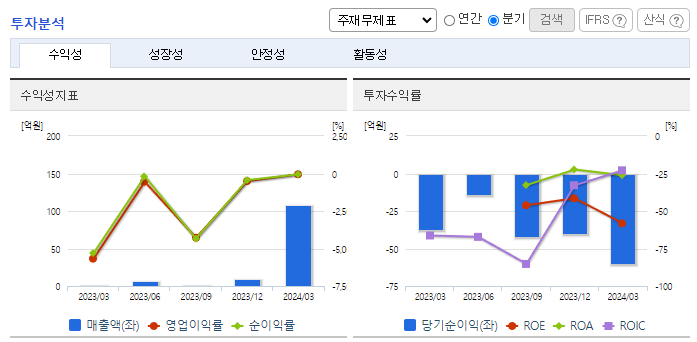 -2024년 3월 전년동기 대비 연결기준 매출액은 15375.7% 증가, 영업손실은 40.8% 증가, 당기순손실은 62% 증가. 2023년 12월 스마트팩토리 컨설팅과 MES 구축 등을 주된 사업으로 영위하는 아이엘포유의 경영권을 인수하는 계약을 체결하였음. 당기부터 종속회사인 아이엘포유의 실적이 매출에 포함되었으나, 아이엘포유 인수에 따른 비용의 증가로 영업손실폭은 확대됨.