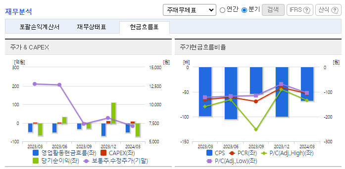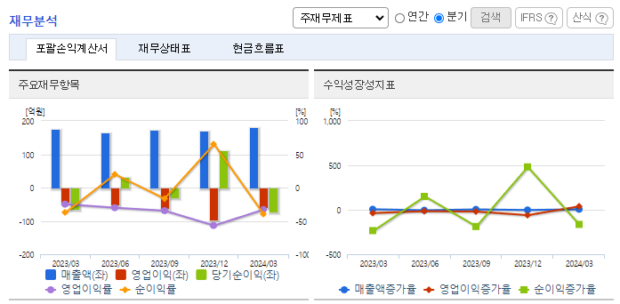 -2024년 3월 전년동기 대비 연결기준 매출액은 2.9% 증가, 영업손실은 36.6% 증가, 당기순손실은 9.2% 증가. 제대혈은행 사업의 성장으로 전체 외형 소폭 확대되었으나, 판매관리비 증가 및 인건비 등의 비용 상승으로 영업손실 확대. 카티스템으로 일본, 말레이시아 등 해외시장 진출을 위한 임상 및 품목허가 등 절차 진행 중. 무릎관절염치료제 스멉셀은 국내 임상 2상이 승인되고 미국 임상 추진 중임.