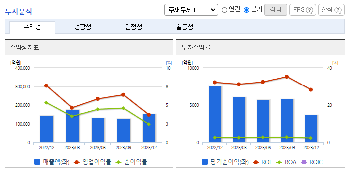 -2023년 12월 전년동기 대비 연결기준 매출액은 12.9% 감소, 영업이익은 1.4% 증가, 당기순이익은 46.7% 증가. 4분기 실적은 대체투자 자산의 충당금 적립 및 손실 반영으로 컨센서스를 하회함. 부동산PF 누적 충당금 2,905억 원, 해외부동산 평가손 1,558억 원 반영. 23년 총 주주 환원액 1조 883억 원, 환원율 51% 수준임. 환원율이 매우 높은 수준이고, 시장과 지속적인 소통으로 자본정책의 예측 가능성도 높음.