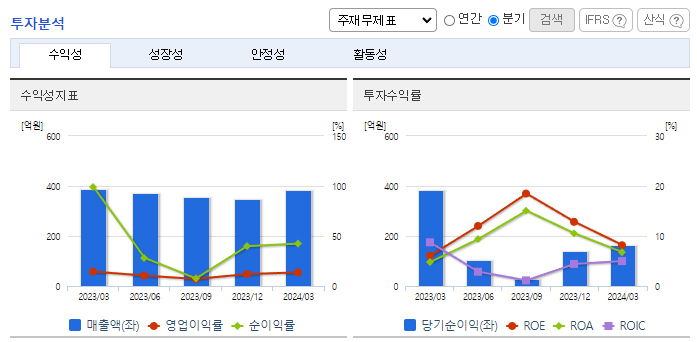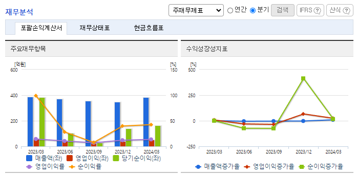 -2024년 3월 전년동기 대비 연결기준 매출액은 1.1% 감소, 영업이익은 6.6% 감소, 당기순이익은 57.6% 감소. 편의점 주류 출고가 인하 압력으로 출고가가 2100에서 1900원으로 낮아졌고 이에 의해 매출 감소와 이익률이 소폭 하락. 제로과당 상품들 잇따라 출시 중. 주당 230원의 고배당을 실현하고 있는 만큼(배당수익률 4.52%), 향후 밸류업 지표에서 주목 가능.