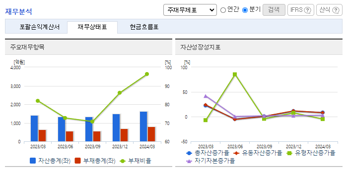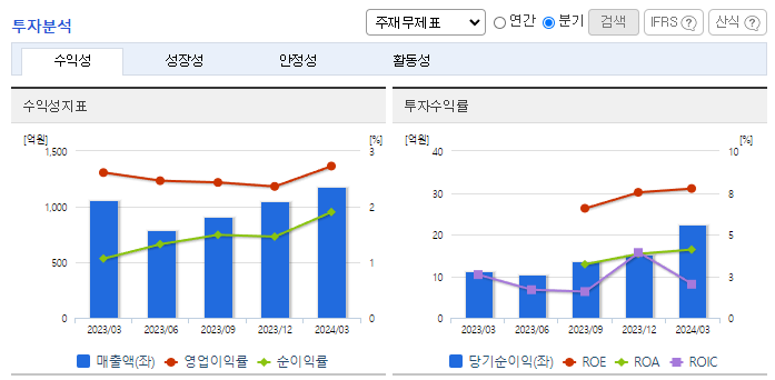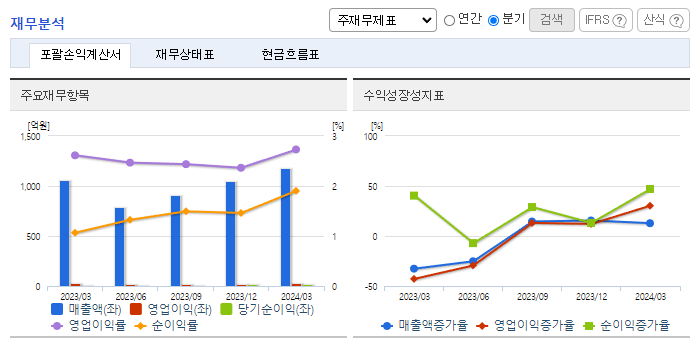 -2024년 3월 전년동기 대비 연결기준 매출액은 11.6% 증가, 영업이익은 16.6% 증가, 당기순이익은 99.2% 증가. 글로벌 경기 회복 및 반도체 업황 개선으로 매출액과 영업이익 등이 증가함. 동사는 메모리, 시스템반도체 등 상품의 99%를 삼성전자에서 매입하고 있으며, 기타 상품으로 디스플레이를 공급하고 있음. 또한 메모리 AS 서비스가 기타 매출로 구성됨.