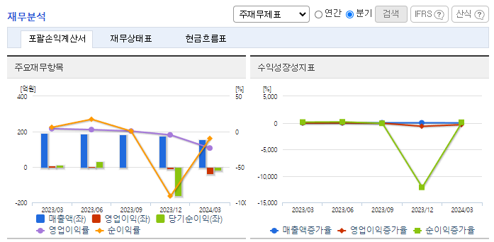 -2024년 3월 전년동기 대비 연결기준 매출액은 18.9% 감소, 영업이익 적자전환, 당기순이익 적자전환. 매출액이 감소했지만 판관비가 4.3% 증가하며 영업이익에 악영향을 줌. 광고선전비가 77.47% 증가하며 부담을 가중시킴. 영상출판미디어의 경우 판타지, 무협 장르 중심 IP를 보유하며, 웹툰 및 웹소설을 제작하여 카카오, 네이버시리즈 등에 공급하고 있음.