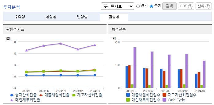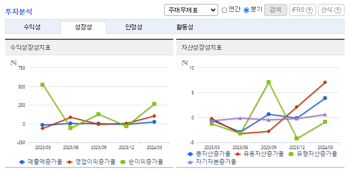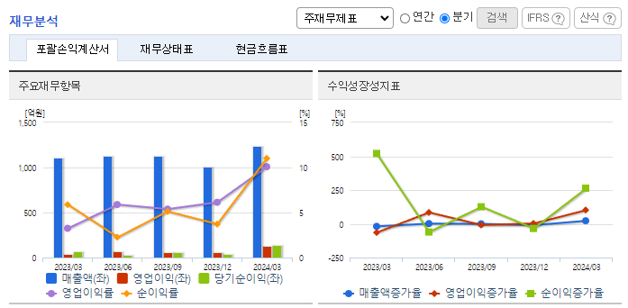 -2024년 3월 전년동기 대비 연결기준 매출액은 12.2% 증가, 영업이익은 248.6% 증가, 당기순이익은 110.9% 증가. 에너지경화수지 제품 단일사업부로 이루어져 있으며, 제8기 1분기 매출액은 124,460백만 원임. 24년 국내 점유율은 50% 이상으로 추정되며, 전 세계 시장점유율은 약 15%로 추정됨. 2024년 02월 21일부터 04월 23일까지 자기 주식취득 결정에 따른, 취득 예정주식 20,000주를 모두 취득하였음.