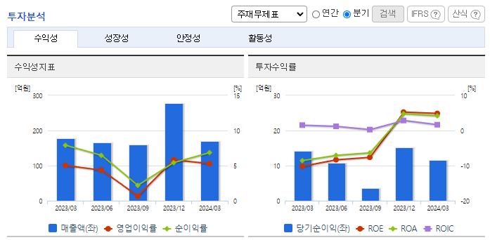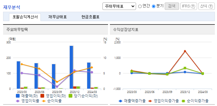 -2024년 3월 전년동기 대비 별도기준 매출액은 5% 감소, 영업이익은 0.1% 증가, 당기순이익은 17.6% 감소. 한국전력공사를 주매출처로 두고 다양한 고객의 확보를 위한 다품종소량 생산체제를 통한 수익성의 극대화에 역점을 두고 가격경쟁력을 확보하는데 노력함. 2024년 1분기 동사의 매출은 제품 매출에서 개폐기, 변압기, 철탑등이 전년 동기 대비 상승하였으나 철강구조물의 매출은 큰 폭으로 감소함.