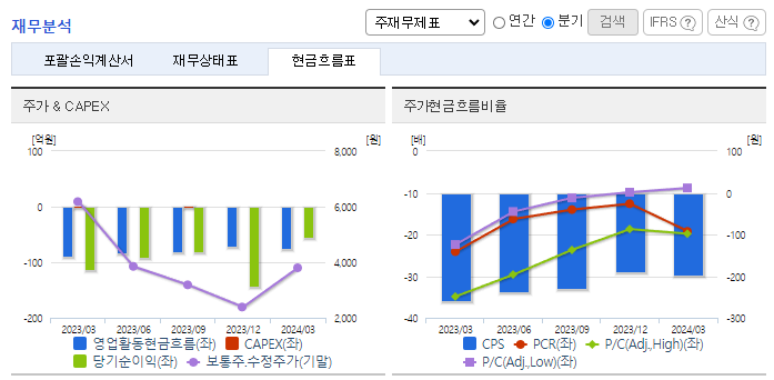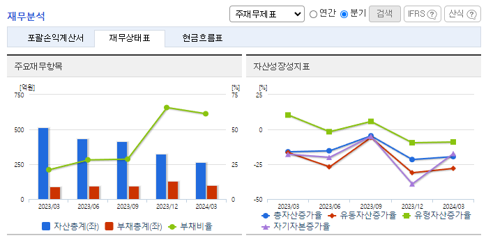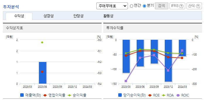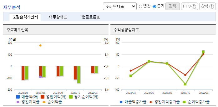 -2024년 3월 전년동기 대비 연결기준, 영업손실은 52.5% 감소, 당기순손실은 52.2% 감소. 개발 과제들의 임상 단계가 진전됨에 따라, 임상 전문 인력을 중점적으로 강화하고 있으며 자체 발굴 신약후보 물질들의 도출과 신규 과제 도입을 통해 지속적으로 파이프라인을 보강해 가고 있음. 최근 4개년 연속 당기순손실을 기록하고 있으나, 연구 개발을 위한 목적으로 유상증자 등 자금 조달 계획 등을 추진하고 있음.