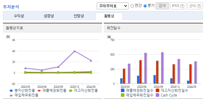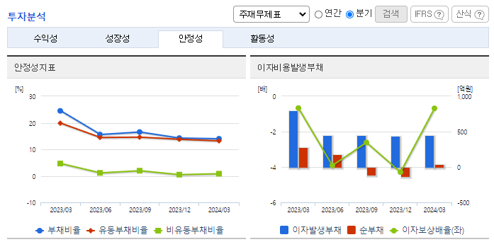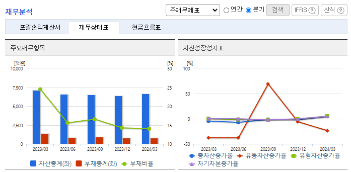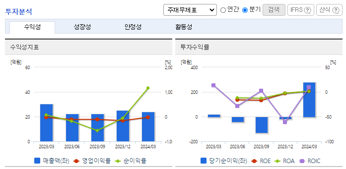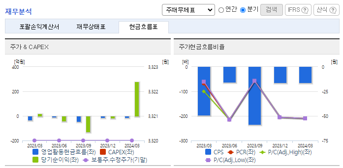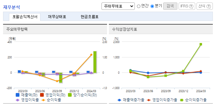 -2024년 3월 전년동기 대비 연결기준 매출액은 20.3% 감소, 영업손실은 20% 감소, 당기순이익은 1245.8% 증가. 동사는 2024.03.21 '감사보고서 제출' 공시에서 2023 사업연도 재무제표에 대한 감사인의 감사의견이 감사범위 제한으로 인한 '의견거절'임을 공시함. 거래소는 개선계획 이행내역서 제출일로부터 20 영업일(2024.06.04.) 이내에 기업심사위원회를 개최하여 상장폐지 여부를 심의·의결 예정.