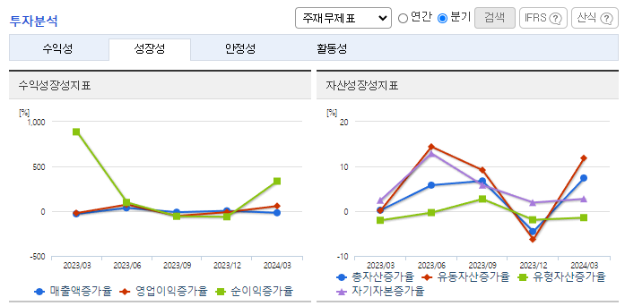 -2024년 3월 전년동기 대비 연결기준 매출액은 3.2% 증가, 영업이익은 15.3% 증가, 당기순이익은 37.2% 증가. 특수목적용 리튬이차전지, 이차전지 소재사업 및 초박형 필름 전지 등 신제품이 IoT 및 4차 산업혁명 시장에 진출하여 수익 개선이 예상됨. 전방산업의 경기 회복이 예상됨에 따라 스마트미터기 시장, 방산 및 군수시장 등은 완연한 회복세를 보일 것으로 예상됨.
