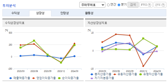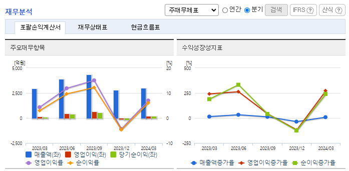 -2024년 3월 전년동기 대비 연결기준 매출액은 2.5% 증가, 영업이익은 65.2% 증가, 당기순이익은 110.6% 증가. 최근 고성장세를 유지하는 해외부문에 대해서도 중장기 측면에서의 현지 시장지배력 확보를 통한 영업실적 기여도 확대가 기대됨. 1분기가 비수기에도 불구하고 어닝서프라이즈를 기록함. 국내외 영업실적 개선 가시화와 관련한 밸류에이션 프리미엄 폭 확대 가능성을 염두할 필요가 있음.