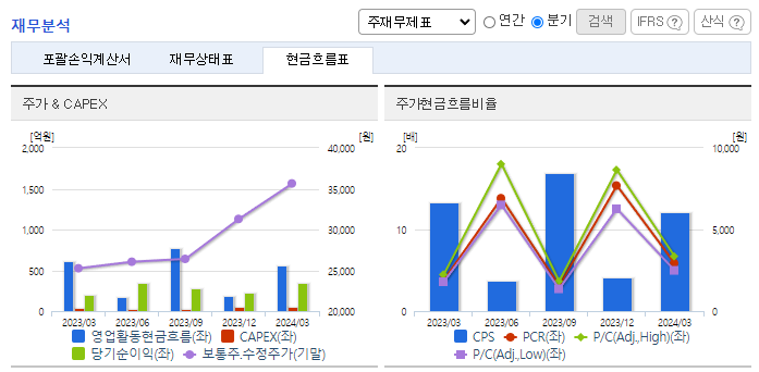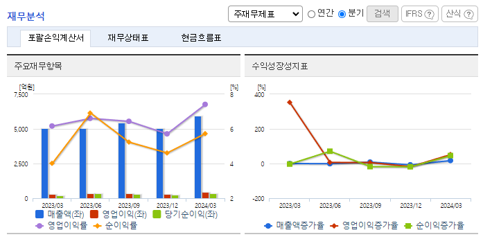 -2024년 3월 전년동기 대비 연결기준 매출액은 17.3% 증가, 영업이익은 41% 증가, 당기순이익은 79.7% 증가. 매출의 51.4%를 차지하는 식품 제조 부문의 매출이 576억 증가함에 따라 전체 매출의 상승을 이끌었음. 중복되고 불필요한 자원낭비를 줄여 효율적으로 활용함에 따라 경영효율성을 확대하여 장기적 성장전략을 구축할 수 있는 발판을 마련하고 있음.