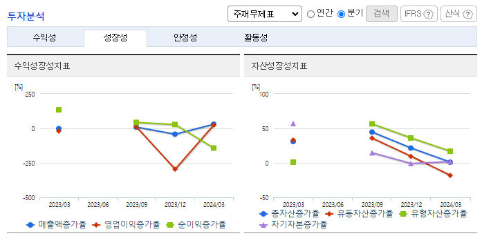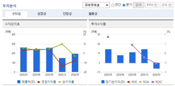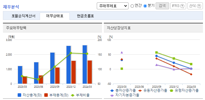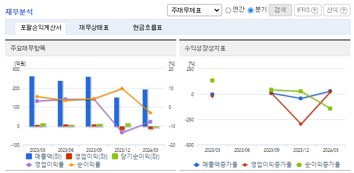 -2024년 3월 전년동기 대비 별도기준 매출액은 24.8% 감소, 영업이익은 85.0% 감소, 당기순이익은 51.5% 감소. 선행 사양으로 제품개발 및 적극적인 마케팅으로 국내 메이저 배터리제조사로부터 지속적인 개발 참여 요청이 접수됨. 이에 따른 매출증가 예상. 다양한 신규고객사와 북미지역 배터리 프로젝트에 대한 공급업체 선정/수주 관련 활동 진행 중. 현재 신규 이차전지 고객사 북미향 양산제품을 수주하여 26년부터 공급할 예정.