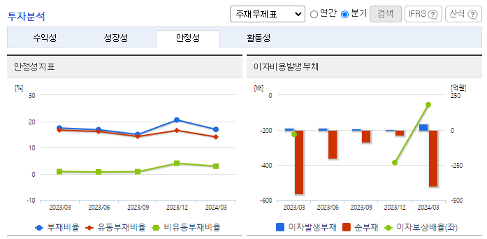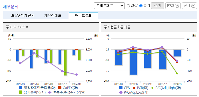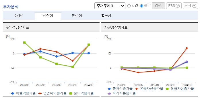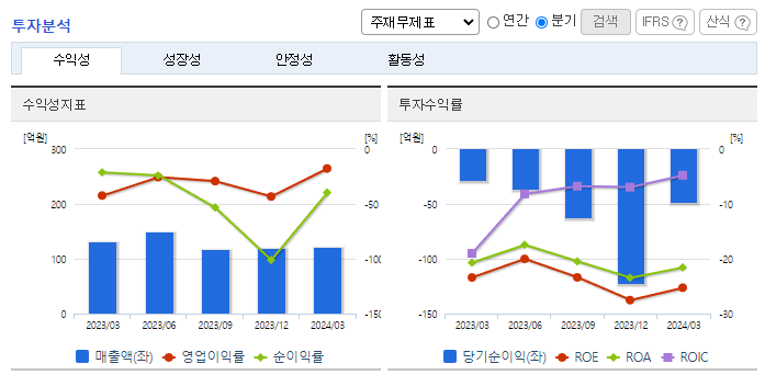 -2024년 3월 전년동기 대비 별도기준 매출액은 8.1% 감소, 영업손실은 61.6% 감소, 당기순손실은 71.4% 증가. 일반의약품, 의약외품 매출 증가와 함께 지급수수료가 30.9% 감소하는 등 판관비 감소로 영업손실이 감소함. 알츠하이머병 치료제 GV1001 관련하여 2024년 3월 3상 임상시험 변경승인을 완료하여 임상시험 개시 준비 중임. 2월에 405억 규모의 유상증자를 통해 투자금 확보함.