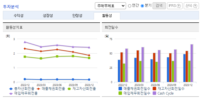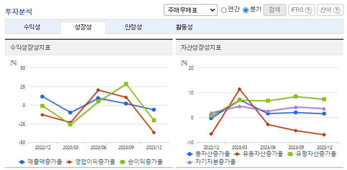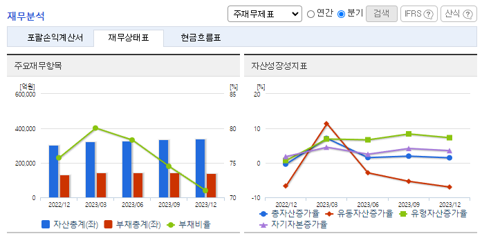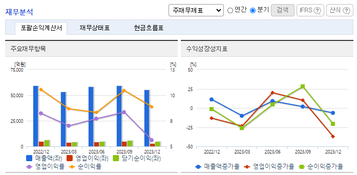 -2023년 12월 전년동기 대비 연결기준 매출액은 12.8% 증가, 영업이익은 9.7% 감소, 당기순이익은 2.9% 증가. 영업이익은 1조 6,334억 원으로 전년 대비 9.7% 감소하였지만 매출은 사상최대 실적을 달성하는 데 성공함. 전자재료 사업부문은 시장에 따라 매출과 영업이익에 영향이 있었으나, OLED용 소재 판매 확대와 편광필름 제조 경쟁력 확보 등 어려움 속에서도 미래 성장을 위한 기반을 마련함.