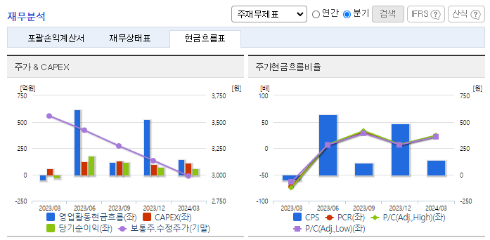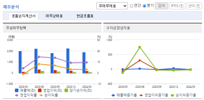 -2024년 3월 전년동기 대비 연결기준 매출액은 5.3% 감소, 영업이익은 120.7% 증가, 당기순이익 흑자전환. 공사비 증가로 인한 건설 경기 부진의 본격화로 인해 시멘트 매출 감소. 다만 시멘트 판매 단가가 상승하면서 영업이익은 크게 성장. 연간 60억 예산의 시멘트 전용선의 취역으로, 하역 작업시간 절반 감소 및 부두 혼잡 문제, 일기 변수 문제 대응력 상향.