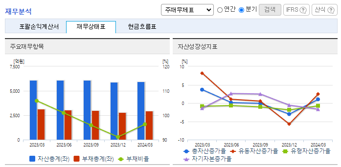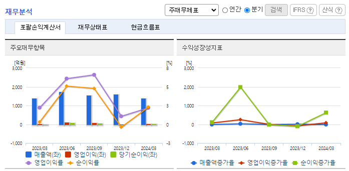 -2024년 3월 전년동기 대비 연결기준 매출액은 0.5% 증가, 영업이익은 0.1% 감소, 당기순이익은 657.6% 증가. 매출 및 영업이익은 거의 변동 없으나 금융수익, 지분법투자이익 및 법인세비용 감소로 당기순이익이 크게 증가함. 지속적으로 대두되는 친환경 이슈에 대응하여 강화된 정부 규제에 적합하고 기존 도료보다 부가 기능이 추가된 프리미엄 제품을 꾸준히 개발 중임.