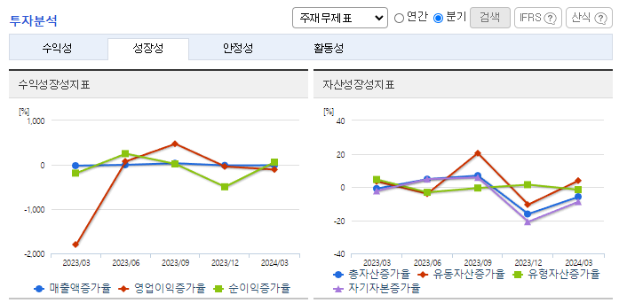 -2024년 3월 전년동기 대비 연결기준 매출액은 5.1% 증가, 영업손실은 96.2% 감소, 당기순손실은 216.5% 증가. 전자 부문의 IR KEY품목의 원재료 등의 단가가 하락하여 매출액이 소폭 증가였음에도 영업이익이 대폭 증가하여 손실폭을 대폭 축소하였음. 해외시장은 성장시장 위주의 제한적인 성장과 선진국 중심의 스마트기기 등 신제품 시장 확대가 예상됨.